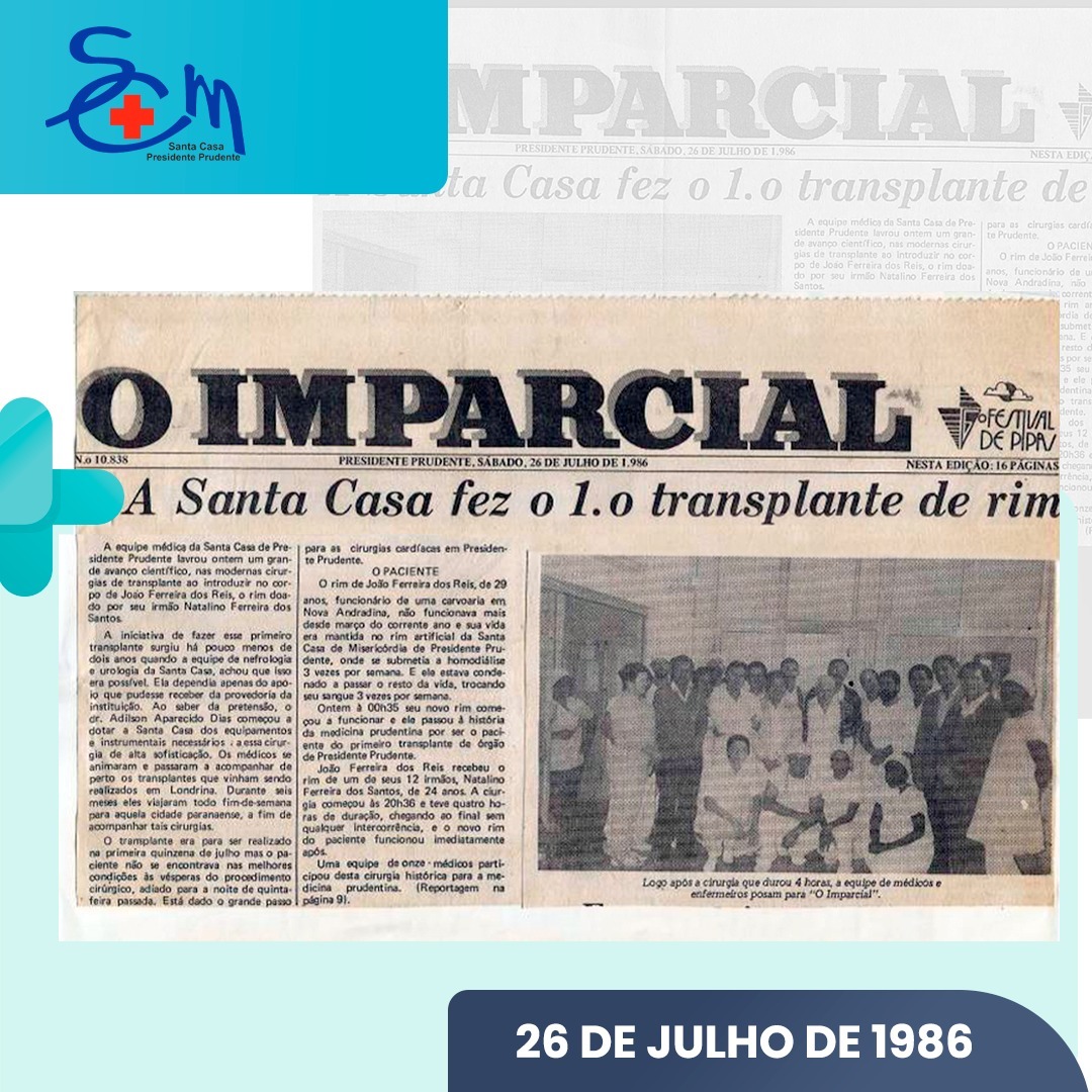 O primeiro transplante de rim no oeste paulista completou 35 anos neste mês. A cirurgia demorou cerca de quatro horas e foi realizada na Santa Casa de Presidente Prudente por um grupo de urologistas do ITC (Instituto Tratamento Cálculo). Nesta terça-feira, parte desta equipe se reuniu em um café da manhã para relembrar esse marco da medicina regional, que garantiu o credenciamento pelo SUS (Sistema Único de Saúde) para a realização deste tipo de transplante na região.